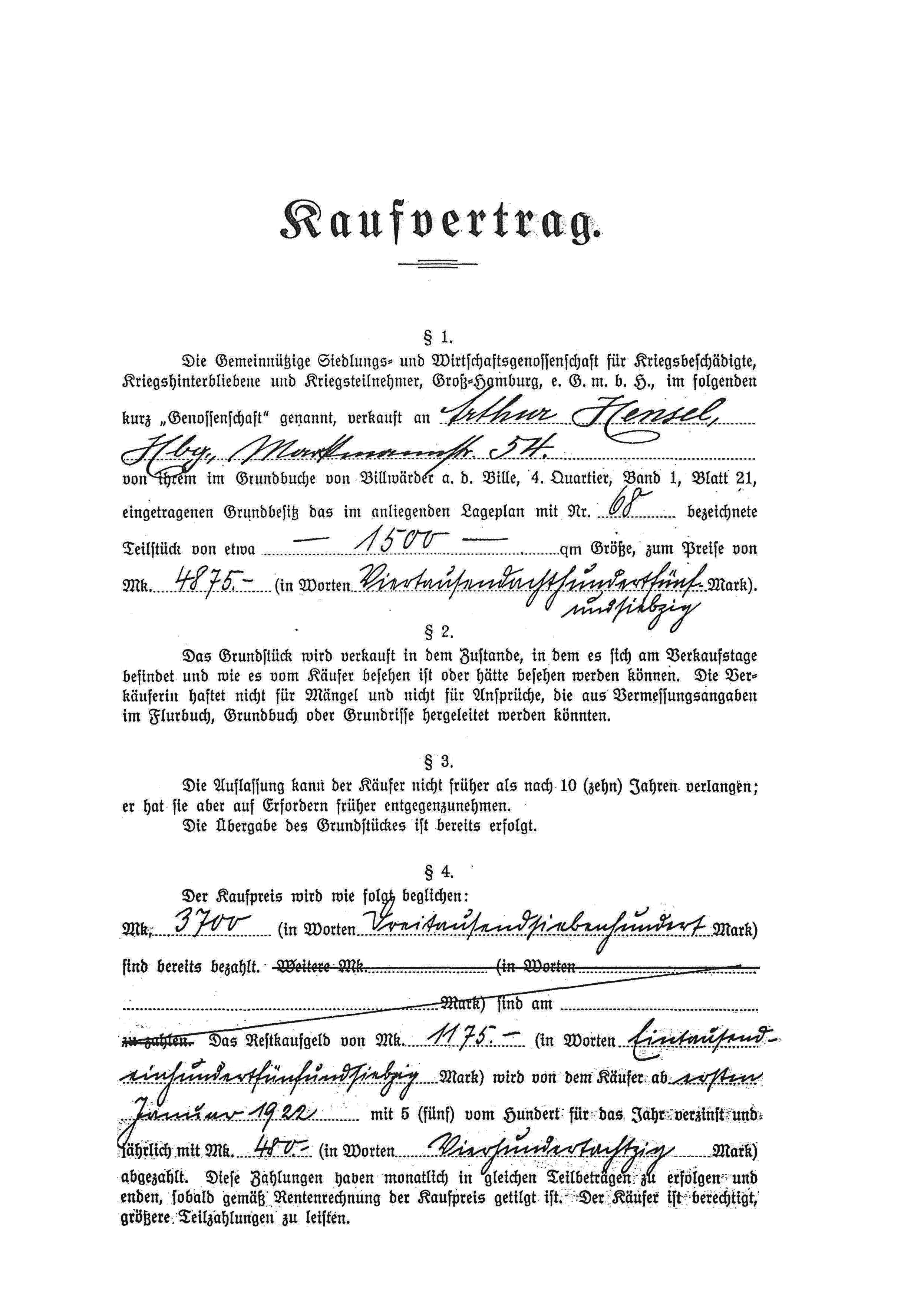 Kaufvertrag von 1922 Seite 1